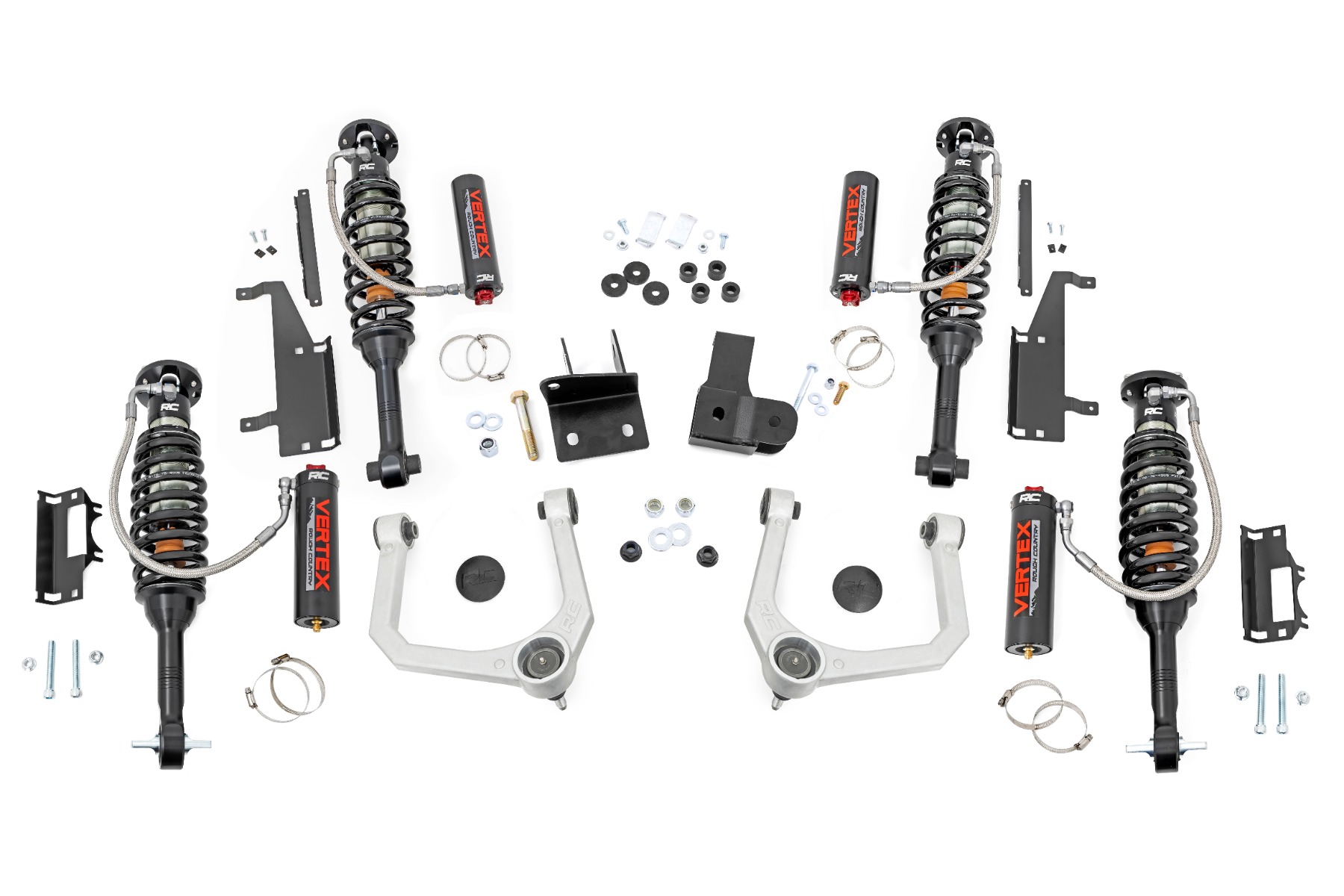 Improved Ground Clearance and Ride Quality. The Ford Bronco is back and better than ever! Rough Country has hit the ground running to give your 2021-up Ford Bronco an improved, aggressive stance with a 3.5-inch lift kit! This suspension kit provides everything needed to lift your vehicle, giving you increased ground clearance to run larger tires while reducing the nose-down factory look for a commanding presence. Innovative Design and Construction. This suspension kit combines the use of aluminum upper control arms and differential spacers to reduce cv angles and ball joint angles. Featuring a set of upper strut spacers that offer uncompromised strength and rigidity gaining lift height is no issue. Completing the rear of this suspension kit included is a rear track bar and brake line relocation that allows you to retain factory-like geometry. This combined setup provides enough clearance to run 35″ tires without additional modifications.