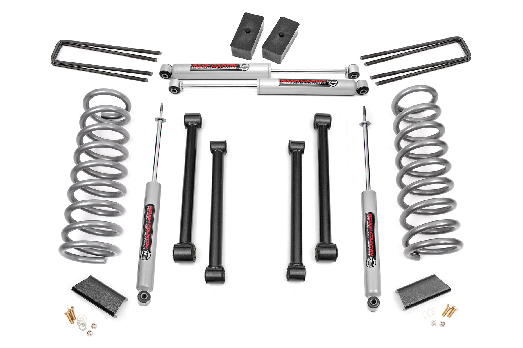 Give your Dodge an aggressive look from front to rear with Rough Country’s 3″ Dodge Suspension Lift Kit! This easy-to-install leveling kit raises the front of your vehicle to be equal height with the rear for a leveled, flush look that gives a better ride height and more aggressive appearance. This kit features a set of front, durable coil springs allowing you gain additional ride height without sacrificing ride quality or performance. A set of control arms and sway bar drop brackets are provided to keep everything at optimum angles for a factory-like ride, even after lifting. Our fabricated rear blocks offer considerably more strength than their cast iron counterparts. A set of Rough Country’s premium N3 shocks are also included in this kit. These fine tuned 10-stage variable high-pressure Nitrogen charged shocks offer a fantastic blend of off-road action and smooth highway ride quality. With a durable 18mm spring-loaded piston rod and faster-cooling 54mm shock body. Get the wheels you want! Rough Country’s 3″ Dodge Suspension Lift Kit comes with everything you need to fit up to a 33″ tire with proper wheel backspacing. Best of all, Rough Country’s 3″ Dodge Suspension Lift Kit is backed by our Lifetime Replacement Warranty.