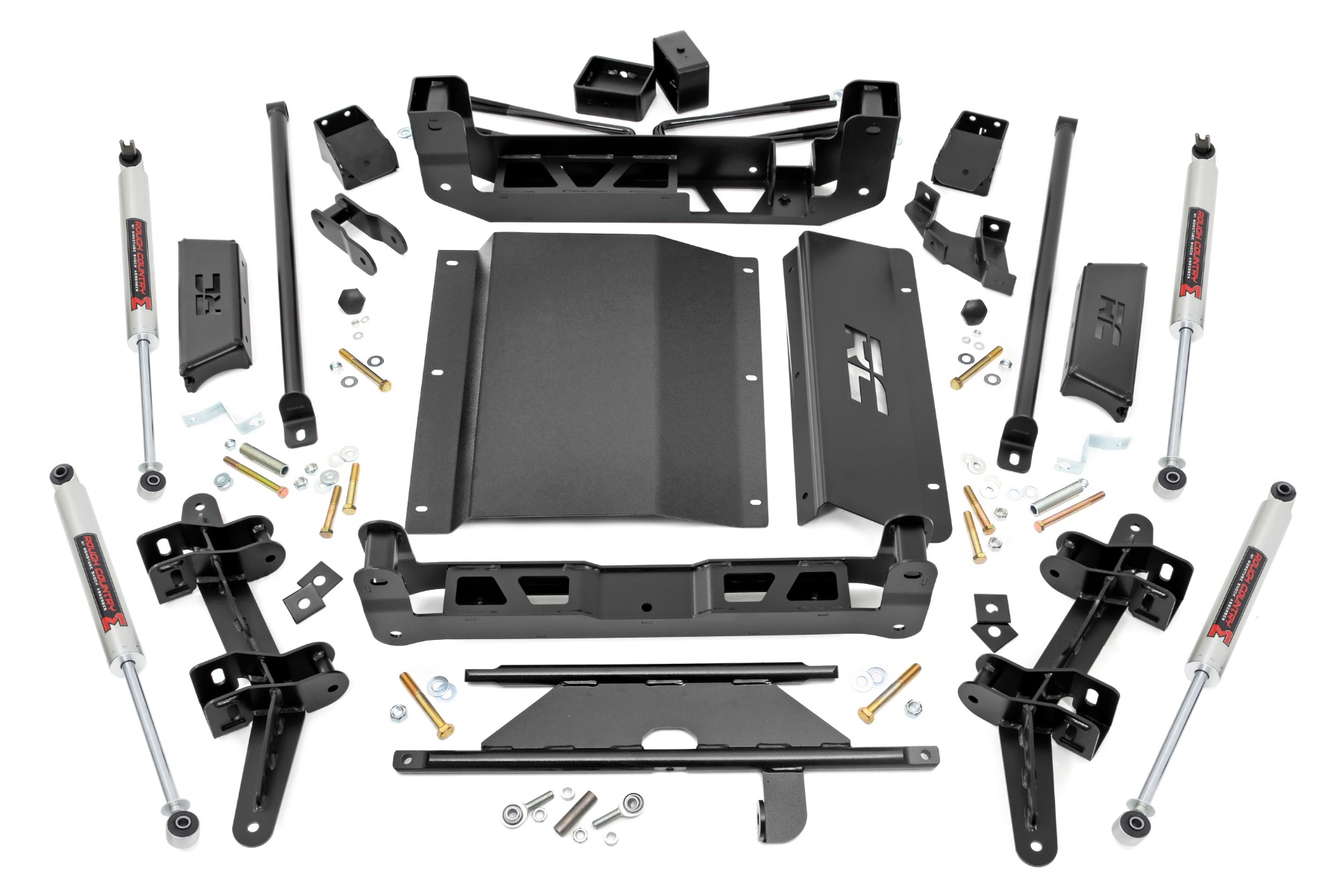 Get a huge boost for your ’88 – ’98 Chevy / GMC 1500, Tahoe, and Suburban with Rough Country’s all-inclusive 4-inch Suspension Lift. This kit features a set of beefy front and rear cross members and differential drop brackets, this kit can take what you dish out and keep on kicking. A set of drop-torsion bar brackets and a durable front skid plate both feature laser-cut RC logos that peak out from under the frame, giving your vehicle an unmistakable look. Rough Country’s 4″ Suspension Kit features (4) M1 monotube shocks, giving your truck incredible ride quality both on and off-road. This kit ships with a massive steering link and Heim joint assist link. Rear lift blocks and add-a-leaf’s give plenty of clearance – enough to accommodate up to 33-inch tires. Our new and improved design allows your vehicle to retain it’s stock track width, and installation is now even easier. This all-inclusive kit comes with everything you need, and best of all this kit features Rough Country’s Lifetime Replacement Warranty.