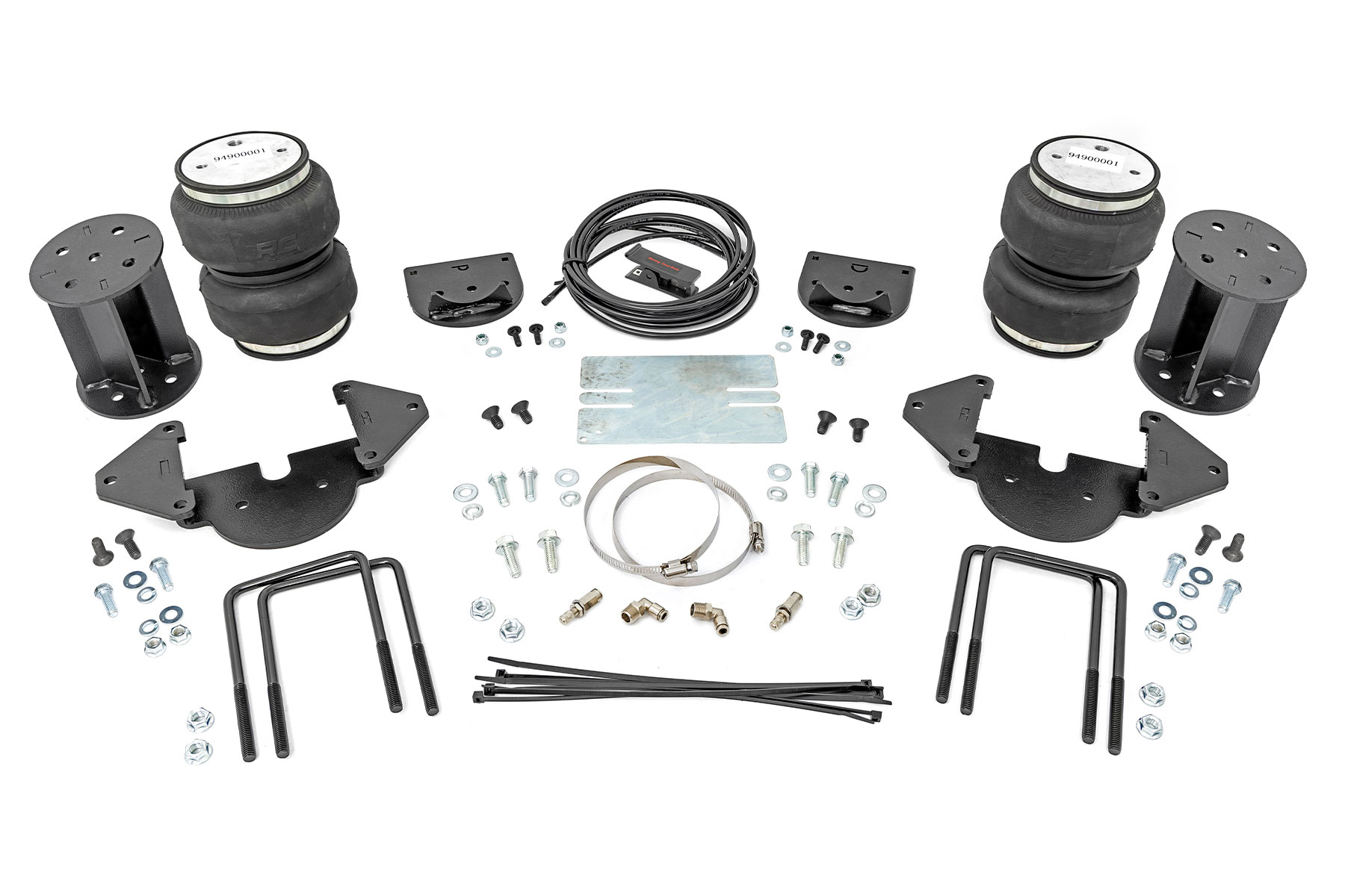 Ideal Leveling. Is your truck your workhorse? The main attraction to the pick-up line is the accessibility to haul and tow as desired. However, due to the amount of weight in the bed, or the condition of the vehicle’s rear leaf springs, this can cause the vehicle to be un-level when under load. Here at Rough Country, we created an innovative new product to ensure that these are troubles of the past. Introducing, Rough Country’s Rear Air Spring Kit. Heavy-duty Construction. Rough Country’s Rear Air Spring Kit features two RC branded high-quality double convoluted airbags complemented with DOT-approved airlines. Whether you plan on towing or hauling in the not-so-distant future Rough Country’s Air Spring kit is the must-have accessory to ensure that your trailer is level reducing the weight off of the tongue of your trailer. Each kit offers 1/4″ push connector fittings and all of the bracketry needed to ensure installation is lightning fast and secure! Rough Country’s Air Spring kit provides up to 5,000 lbs. of load support to ensure that you experience less sway and bottoming out when braking and steering! Installation. With an estimated timeframe of 1-2 hours this full kit can be installed at home using standard tools and can be completed efficiently and quickly! Limited Lifetime Replacement Warranty. Rough Country’s Rear Air Spring Kit is backed with a limited-lifetime replacement warranty towards manufacturer defects. As such, the product is protected from structural and workmanship damage after the date of purchase. With our industry-leading warranty give yourself peace of mind when using Rough Country’s Suspension products!