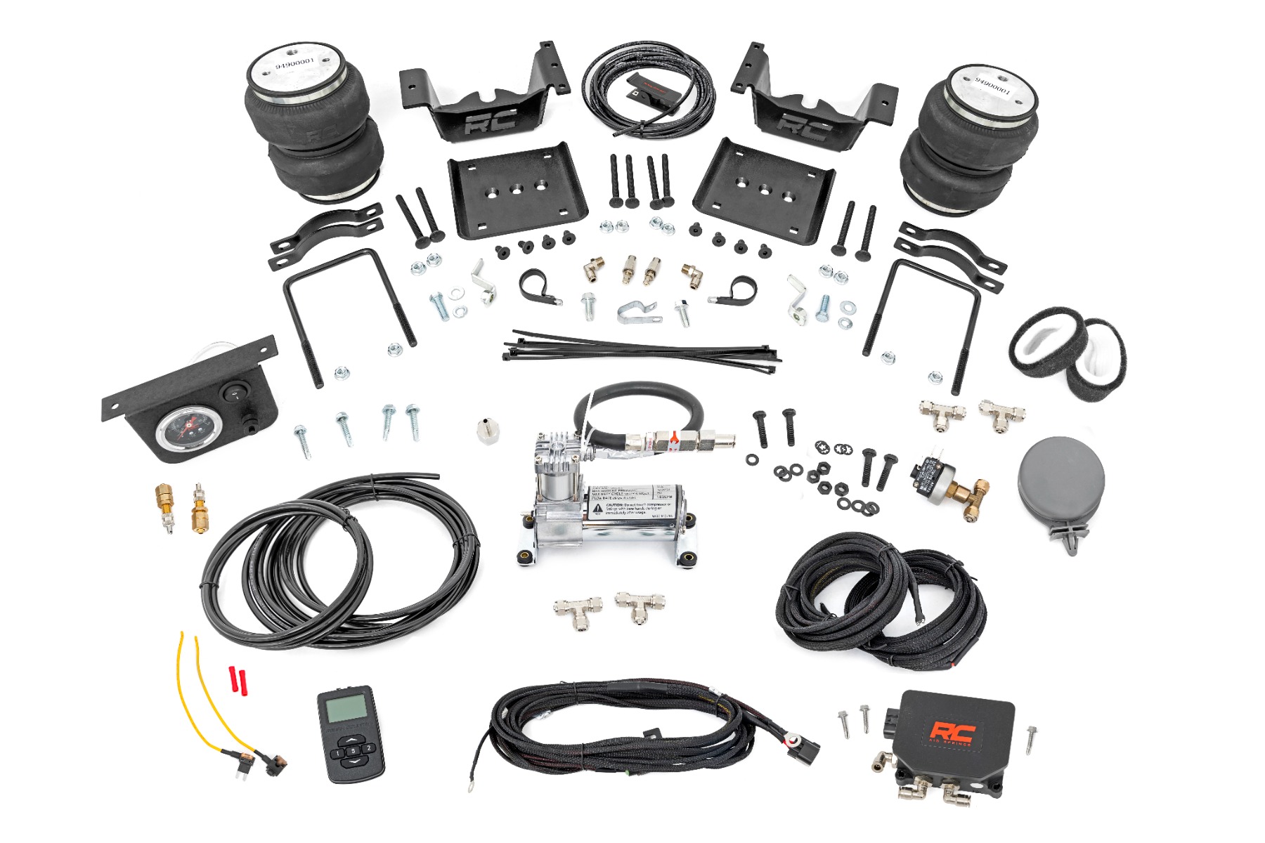 Ideal Leveling. Is your truck your workhorse? The main attraction to the pick-up line is the accessibility to haul and tow as desired. However, due to the amount of weight in the bed, or the condition of the vehicle’s rear leaf springs, this can cause the vehicle to be un-level when under load. Here at Rough Country, we created an innovative new product to ensure that these are troubles of the past. Introducing, Rough Country’s Rear Air Spring Kit. Heavy-duty Construction. Rough Country’s Rear Air Spring Kit features two RC branded high-quality double convoluted airbags complemented with DOT-approved airlines. Whether you plan on towing or hauling in the not-so-distant future Rough Country’s Air Spring kit is the must-have accessory to ensure that your trailer is level reducing the weight off of the tongue of your trailer. Each kit offers 1/4″ push connector fittings and all of the bracketry needed to ensure installation is lightning fast and secure! Rough Country’s Air Spring kit provides up to 5,000 lbs. of load support to ensure that you experience less sway and bottoming out when braking and steering!