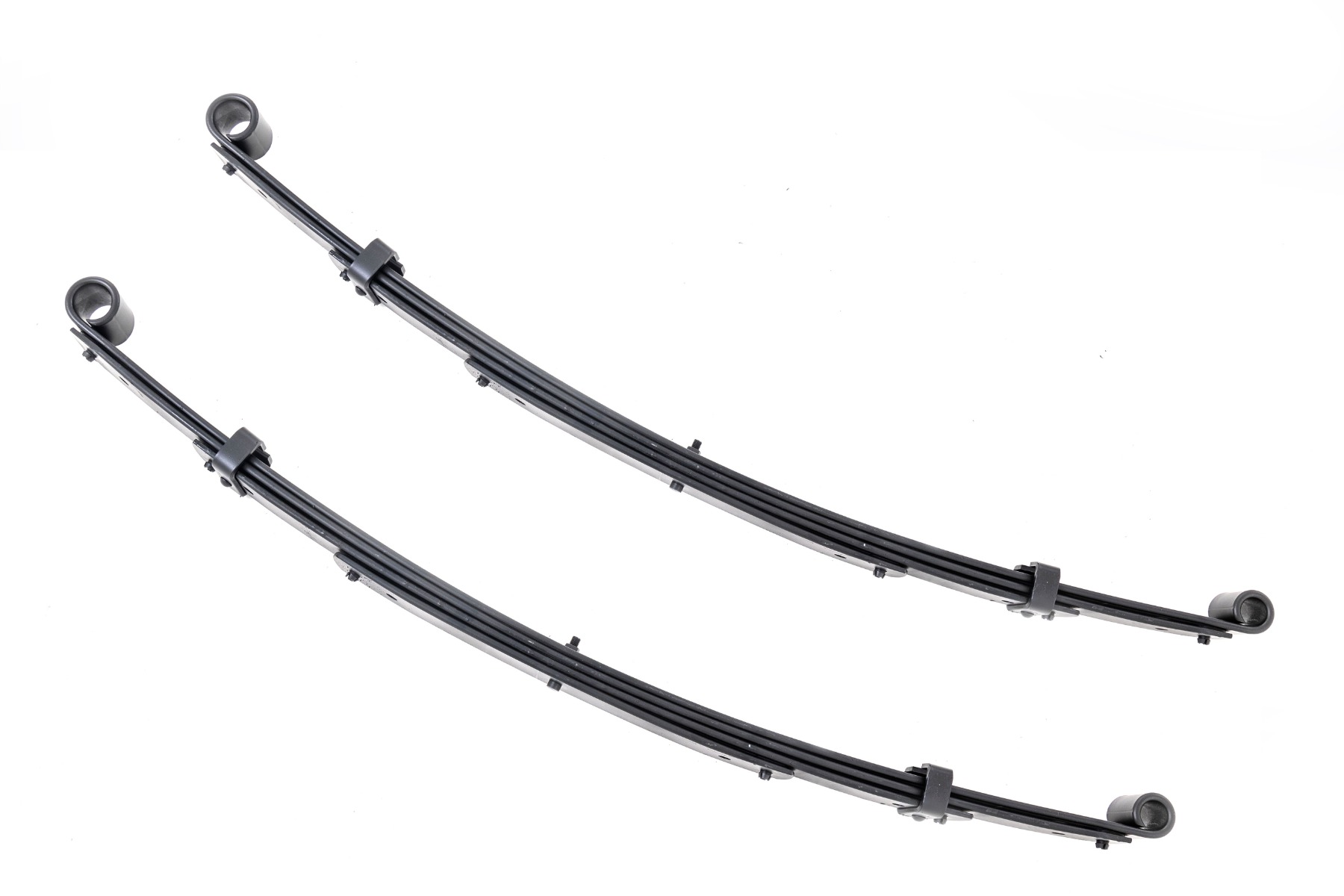 Added Lift Height and Ride Comfort. Take your suspension kit to the next level with Rough Country’s Replacement Leaf Springs. Constructed from high-quality materials and designed specifically for the weight of your vehicle. This enhanced replacement spring will provide a factory-like feel while retaining your suspension lift height. Durable and Off-Road Ready. Rough Country’s Replacement Leaf Springs are designed to tackle any terrain that they are faced with. Featuring a multi-leaf design and spring pads this reduces the friction and maximizes comfort. Each leaf pack utilizes tapered leaves for improved flexibility at their ends. Installation. Rough Country’s Replacement Leaf Springs offer a 100% bolt-on installation estimated to take approximately 1-2 hours depending on vehicle condition. Simply remove the pre-existing leaf spring and use the stock hardware to equip your vehicle with this high-quality replacement. Lifetime Replacement Warranty. Rough Country’s Replacement Leaf is backed with a 5-year replacement warranty towards manufacturer defects. As such, the product is protected from structural and workmanship damage after the date of purchase. With our industry-leading warranty give yourself peace of mind when using Rough Country’s Suspension products!