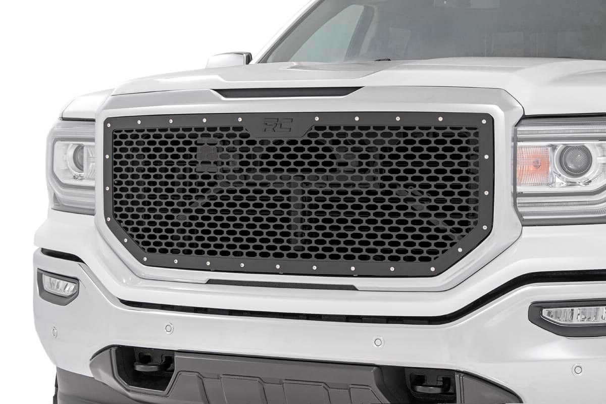 Give the front-end of your GMC 1500 a unique look with Rough Country’s Mesh Grille kit. This grille replacement kit swaps out your stock grille with the eye-catching, head-turning good looks of this aftermarket upgrade. With a unique, laser-cut mesh pattern surrounded by stylish, stainless steel rivets, this grill gives your truck a more menacing look that’s sure to draw attention. Each kit is powdercoated black to resist corrosion and give a long lifespan of good looks.